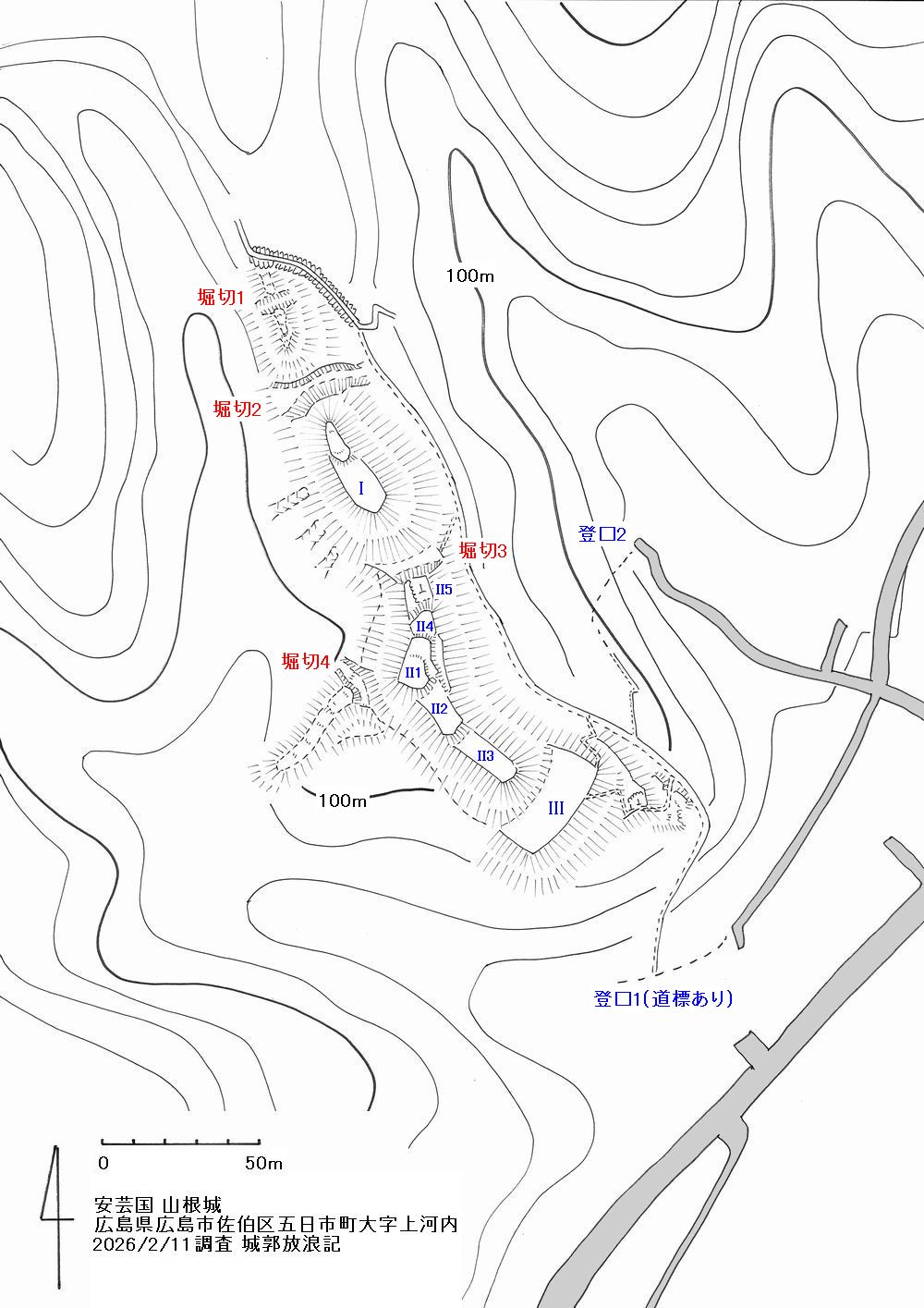 曲輪群IIはII1を中心に南北に小さな段を設けている。北側のII5は墓地造成による改変があり、主郭Iと区画する堀切3を設けている。また西へ伸びる支尾根は堀切4で遮断しており、その先の尾根は緩斜面ではあるが明確な曲輪の造成は確認できない。
