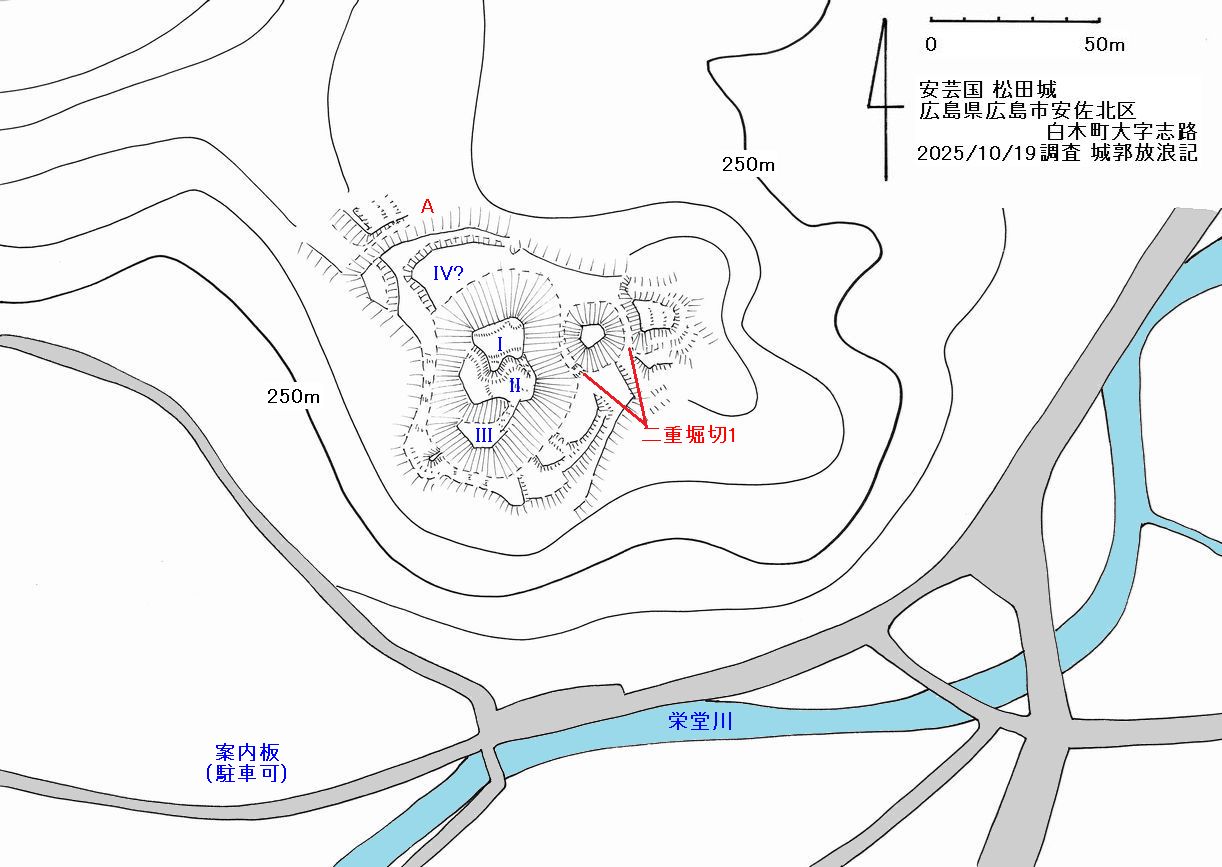 詳細不明。南北朝期に志道村地頭職を有していたと考えられている松田氏の城とされる。松田氏は室町幕府奉公衆で、案内板にある松田丹後守晴秀は足利義晴、義輝に仕えていた。