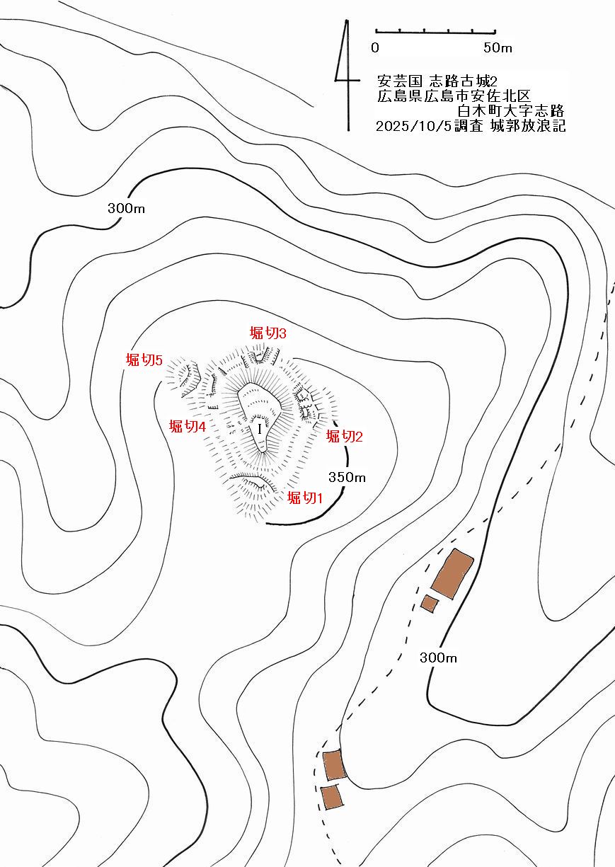 志路古城2は栄堂川南岸の比高100mほどの山に築かれている。