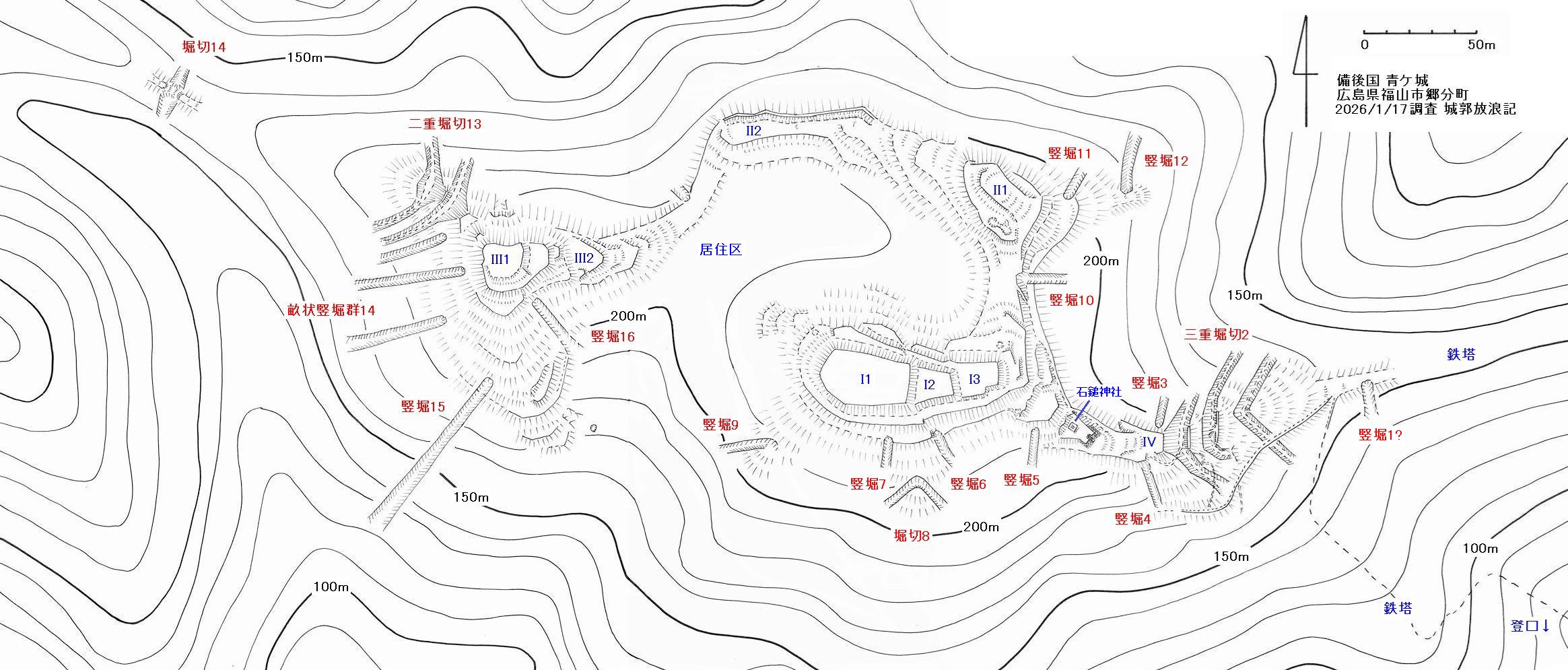曲輪群IIは最高所のII1を中心に小さく段が築かれているが削平は甘く緩やかに傾斜する。西に伸びる尾根にII2があり、北側に土塁状の高まりと溝があるが、これは耕作にともなう造成のようである。