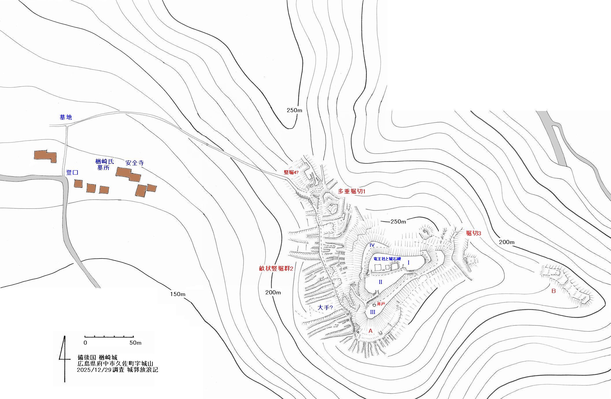 主郭部I、IIの南面を覆うように曲輪III、北側は帯曲輪IVを設けている。曲輪IIIには石組み井戸があるが埋もれている。