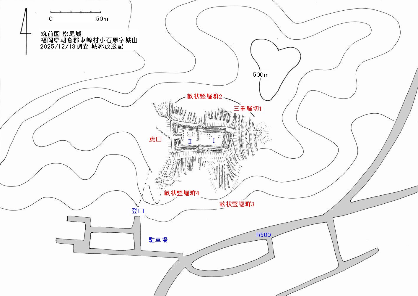 松尾城は国道211号線と国道500号線が交わった地点の北方にある比高50m程の丘陵に築かれている。現在は県指定史跡として公園整備されており、登口にはトイレはないが駐車場がある。