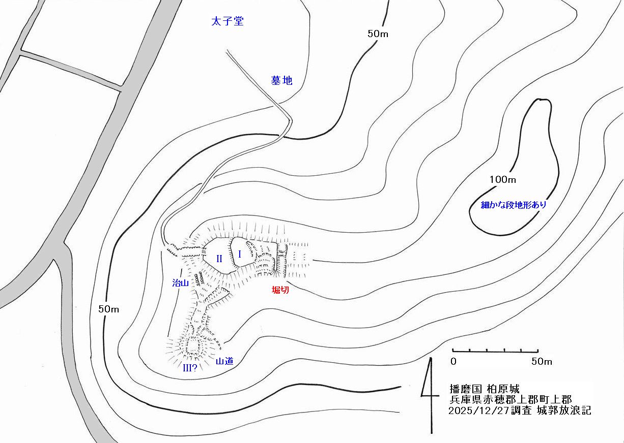 柏原城は西へ伸びた丘陵の先端頂部に築かれている。いまは荒れているが北麓の太子堂奥にある墓地から遊歩道が設けられている。