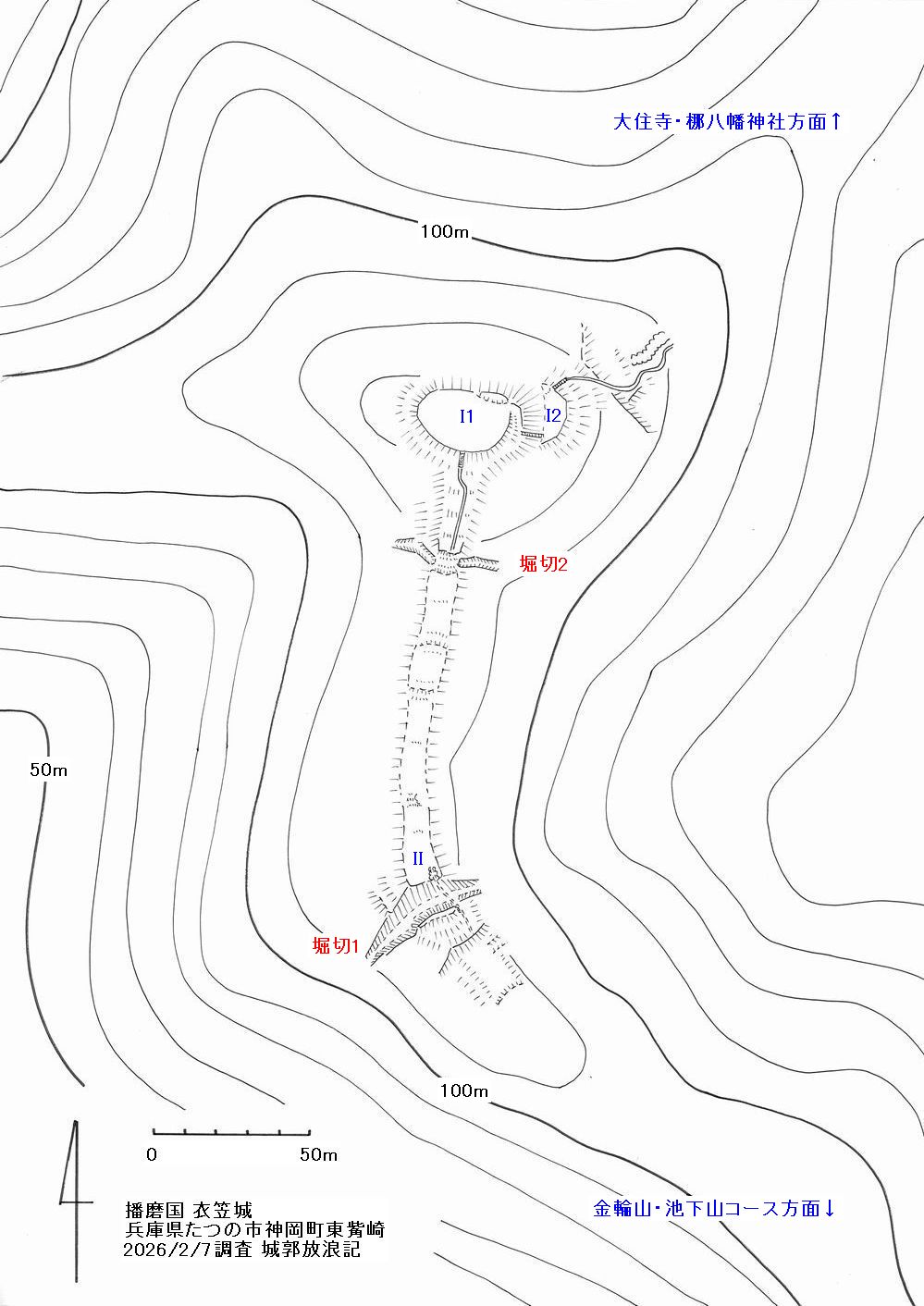 主郭は標高133mの山頂にあるI1で東下に腰曲輪I2がある。主郭は土塁もなく切岸も緩くパットしない。主郭から西や北東の尾根には明確な堀は見当たらない。