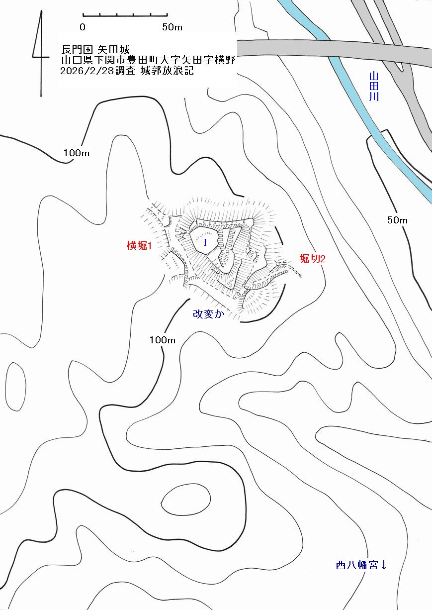 矢田城は西八幡宮の北西背後、山田川に面した標高110mほどの山に築かれている。