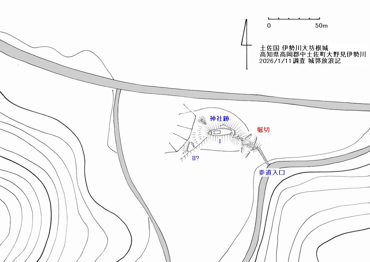 主郭Iは金比羅神社の境内であったがいまは荒廃している。唯一の城郭遺構は東尾根を遮断する堀切で岩盤を削った規模の大きな堀切である。南北両側面は切り立った崖地形で容易に無ぼることはできない。