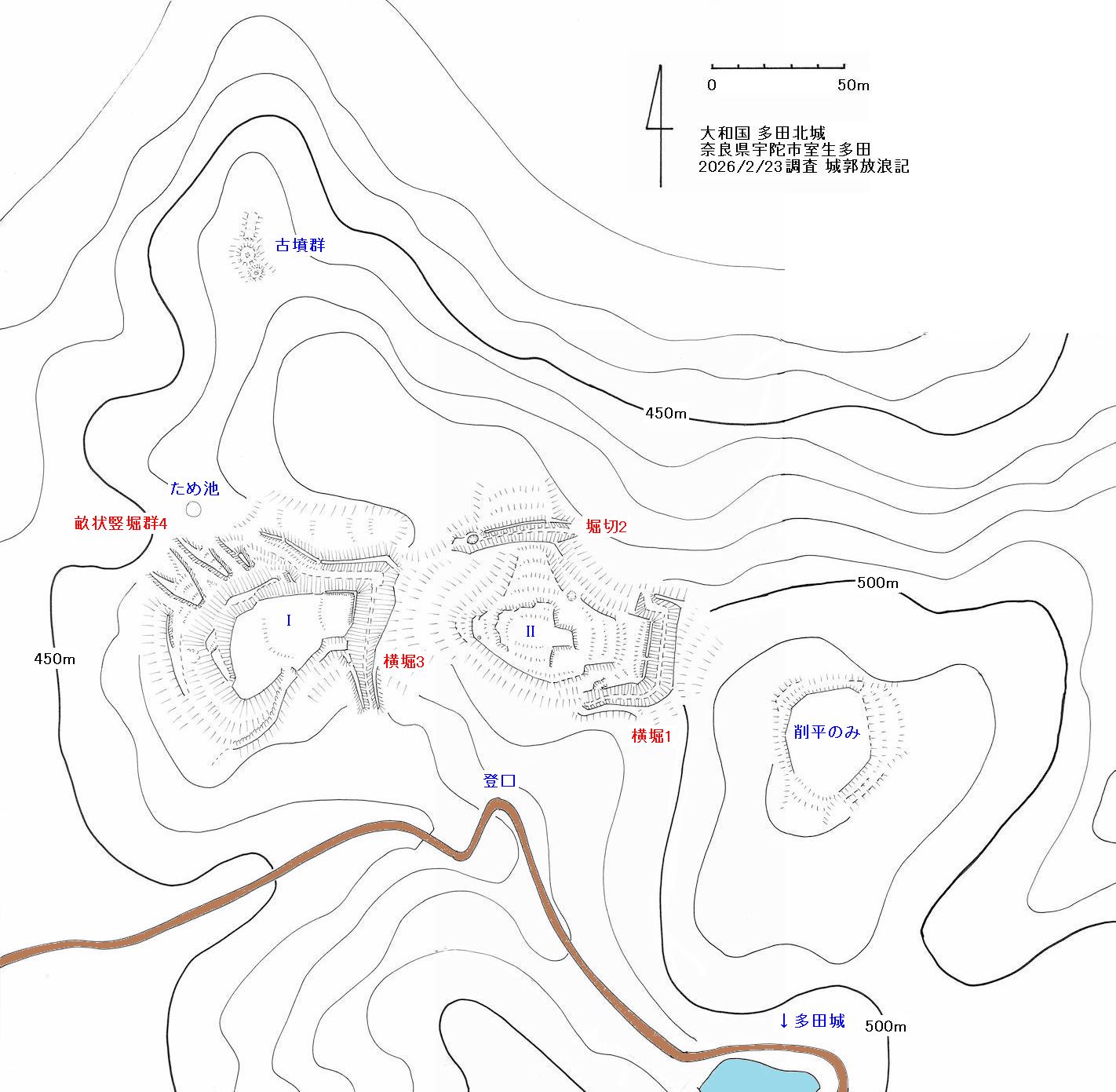 多田城との間の谷に林道がある。最初にS字にクランクする部分から登ると曲輪IIに行ける。